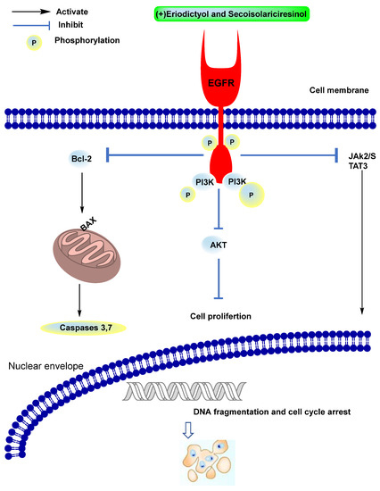 As previously reported, the EGFR is involved in the pathogenesis of human carcinoma. Different mechanisms can lead to increased EGFR signaling in cancer cells: overexpression of the EGFR that, in some cases, has been associated with gene amplification; activating mutations of the EGFR; and increased expression of EGFR ligands. Targeting EGFR inhibition is a leading therapeutic objective against cancer. There are two main classes of anticancer agents affecting the EGFR: those targeting the extracellular ligand-binding domain and those blocking the intracellular tyrosine kinase (TK) domain. As shown in Figure 3, the downstream signaling pathways of EGFR, including PI3K/AKT/mTOR and JAK2/STAT3, lead to the activation of the P53 protein and other apoptosis-related genes Bax and caspase3,8,9, hence resulting in DNA fragmentation and induction of apoptotic cell death in cancer cells. Therefore, molecular mechanisms leading to intrinsic or acquired resistance to anti-EGFR drugs are common in human carcinomas [30,31,32,33].