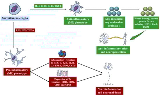 Soluble form of hyperphosphorylated tau may trigger the phenotypic alteration in microglia, which can further cause loss of immunosurveillance activity and mediate AD progression via the formation of NFTs [26]. Collectively, these findings suggest that phenotypic alterations in microglia including behavior, proteomic signatures, and morphology are linked with AD progression [31,32]. It has been revealed that M1 microglia secrete various inflammatory chemokines and cytokines, which can result in neuronal death and inflammation (Figure 1) [33], whereas tissue repair and maintenance are linked with alternative M2 microglial activation [34]. In addition, M2 microglia mediate neuroprotection and anti-inflammatory effects, whereas M1 microglia mediate neurotoxicity and inflammation. Indeed, both of these phenotypes play roles in the NDs, thus microglia have the capacity to play role as a double-edged sword in NDs [35]. Therefore, precise regulation of microglia activation is important for the normal activity of microglia to prevent NDs and maintain brain homoeostasis [36].