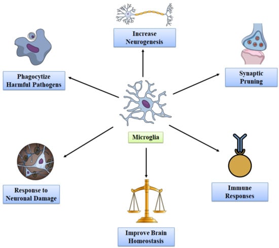 In addition, damaged and/or old microglia get replaced with new healthy microglia during aging and disease conditions. In the adult brain, microglia help in tuning synapse strength and regulating long-term potentiation (LTP), which is accountable for constant long-term neural networks [65,66]. In mature CNS, microglia maintain the synaptic plasticity via secreting several soluble molecules that are accountable for controlling memory and learning and also for increasing LTP responses mediated by N-methyl-D-aspartate (NMDA). Microglia also mediate the basal glutamatergic signaling and regulation of GABAergic transmission via adenosine triphosphate (ATP) and brain derived neurotrophic factor (BDNF) [67,68]. BDNF is important for the phosphorylation of tyrosine kinase B, which is accountable for synaptic plasticity. Mouse models with microglia depletion exhibited decreased capacity in several learning tasks and reduced levels of motor learning linked with synaptic formation. Collectively, these findings suggest that microglia are crucial for synaptic remodeling and learning [64]. Microglia also play roles in activity-dependent structural remodeling driven via age-related factors and sensory input [60,69]. In Figure 2, we have summarized the beneficial effects of microglia in healthy adult brains.