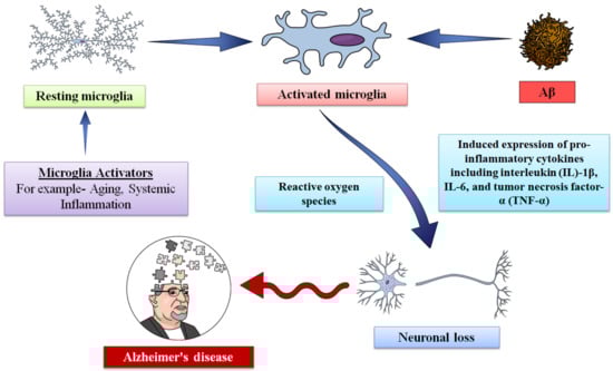 Amyloid beta (Aβ) is derived from the amyloid precursor protein that plays a crucial role in AD pathogenesis [100]. Aβ plaques are formed because of the aberrant aggregation and accumulation of Aβ and these plaques are considered as one of the major pathological AD hallmarks [101]. Common Aβ subtypes including Aβ1–40 and Aβ1–42 also play crucial roles in AD development. Aβ oligomers have a significant contribution in early AD stages, whereas Aβ fibers have a significant contribution in prolonging the inflammatory response. It has been reported that activated microglia can generate an increased level of glutamic acid, which is induced via NMDA receptor through signaling mechanisms, that eventually can result in toxicity [102]. Outside the synapse, Aβ could be induced to elevate the deposition via the activated NMDA receptor [103]. Microglia possess various receptors on their surfaces that interact with Aβ and play role in chemotaxis to microglia, including receptor of advanced stage glycosylation end production and scavenger receptor (SR) [104]. It has been observed that macrophage colony-stimulating factor also plays role in chemotaxis, which is released via microglia and activated via Aβ. Various chemotactic factors including monocyte chemoattractant protein-1 (MCP-1) induce microglia to gather in Aβ deposition [105]. Activated microglia might involve themselves in Aβ phagocytosis via SRs and cause Aβ hydrolysis via the secretion of insulin hydrolytic enzymes, alpha secretases, and metalloproteinases [106].