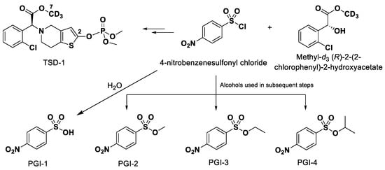 The presence of potential genotoxic impurities (PGIs) in pharmaceutical substances and products continues to receive increased attention because of the related risks to human health. These PGIs can cause genetic mutations, chromosomal breakage, and chromosomal rearrangements and may cause cancer in human beings [8,9,10]. To ensure the safety of drug use, the European Drug Administration (EMA), the United States Food and Drug Administration (FDA), and the International Council of Harmonization (ICH) issued relevant guidelines on the control of PGIs in active pharmaceutical ingredients (APIs) [11,12,13]. The manufacture of APIs may produce PGIs; so, trace amounts of PGIs in drugs must be monitored and regulated to ensure public safety [14,15,16,17]. TSD-1 is synthesized from 4-nitrobenzenesulfonyl chloride. During the process of chemistry synthesis, residual 4-nitrobenzenesulfonyl chloride is hydrolyzed to form 4-nitrobenzenesulfonic acid (PGI-1) or react with the solvent used, including methanol, ethanol, and isopropanol to form methyl 4-nitrobenzenesulfonate (PGI-2), ethyl 4-nitrobenzenesulfonate (PGI-3), and isopropyl 4-nitrobenzenesulfonate (PGI-4), (Figure 2). All four compounds may remain in the API and be assessed as potentially genotoxic by (Q)SAR software (Toxtree Version 3.1.0, TOPKAT (BIOVIA toxicity prediction model) Version 6.2), since the threshold of toxicological concern (TTC) limit is 1.5 μg/day according to ICH M7 [18,19], and the limit is 15.0 ppm, when the daily dose of TSD-1 is 100 mg.