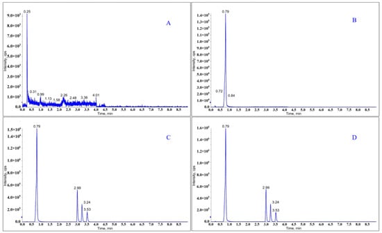 MRM chromatograms of (A) blank solutions, (B) TSD-1 sample solutions, (C) mixed standard solutions, and (D) sample spiked with mixed standard solutions.