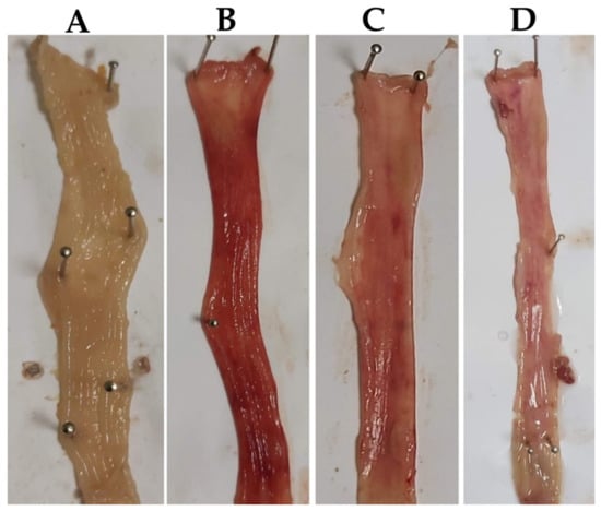 The Gross morphological depiction of colons. (A) Normal control, (B) acetic acid-treated, (C) SA (40 mg/kg)-treated and (D) PDRL (2 mg/kg)-treated rats.