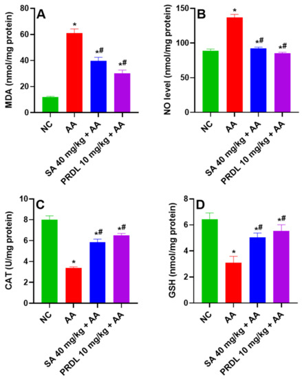 Levels of (A) MDA, (B) NO, (C) CAT and (D) GSH in in AA-induced ulcerative colitis rats. The results are presented as mean ± SEM (n = 6) per group. * denotes significant differences compared to the control group (p < 0.05); # denotes significant differences compared to the AA group (p < 0.05).
