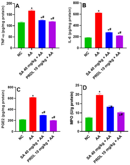 AA-induced colitis caused due to widespread intracellular acidification causes erosion of mucosal barriers that ultimately damage the colonic epithelium, which induce activation of inflammatory cytokines releasing cells monocytes and macrophages. The inflammatory cytokines (TNF-α and IL-6) release several chemokines and promotes chemotaxis [36]. SA significantly reduced the elevated level of the inflammatory cytokines (TNF-α and IL-6) thus exhibiting a potent anti-inflammatory effect; our previous reports further corroborate these findings [8,18]. In addition to TNF-α role in enhanced endothelial cell permeability, decreased pain threshold, leukocyte generation, and enhanced prostaglandin (PGEs) levels, in the gastrointestinal epithelium of gastric mucosal tissue, that is a paracrine fashion [38]. In rodent models of AA induced intestinal inflammation, MPO and PGEs levels offer a quantifiable measure of disease severity [39]. MPO and PGEs levels in the inflamed colon were estimated in our study. The pretreatment of SA 40 mg/kg and PDRL medication was able to reduce MPO and PGEs levels in dose-dependent fashion, which may be interpreted as a manifestation of the test compound’s anti-inflammatory properties in the AA model [40].