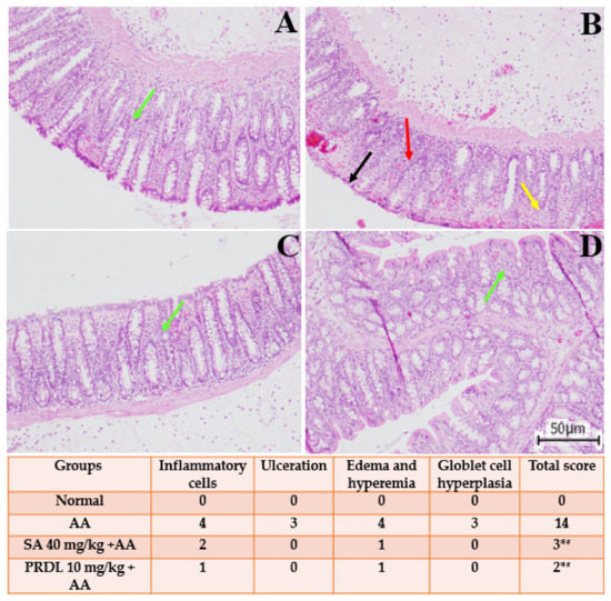 Histopathological observations along with their intensity. Histological colonic sections of a normal rat showing normal mucosa (green arrow) (A). Animals in AA group showing active colitis with stromal edema, superficial erosions (black arrow), inflammatory cell infiltration (yellow arrow) with broadly ulcerating mucosa (red arrow) (B). SA 40 mg/kg + AA group animals showing ameliorative epithelial changes with ulcer healing and inflammatory cells along with lymphoid follicle (green arrow) (C). Animals in (PDRL 10 mg/kg + AA) group exhibiting healing ulcer and attenuation of cell damage (green arrow) (D). The results are presented as mean ± SEM (n = 6) per group. * denotes significant differences compared to the control group (p < 0.05); # denotes significant differences compared to the AA group (p < 0.05).