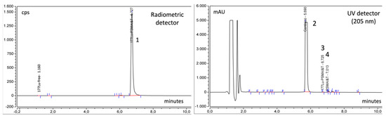 Typical radiometric and UV chromatograms of [177Lu]Lu-PSMA-I&T syntheses are shown in Figure 2, which shows the difference between the retention time of [177Lu]Lu-PSMA-I&T and the precursor PSMA-I&T (6.72 and 7.01, respectively). The largest peak in the UV chromatogram is gentisic acid. The radiometric detector evidences the high radiochemical purity of the product, since only the peak of [177Lu]Lu-PSMA-I&T is present.