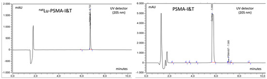 Chromatograms of standard solutions of natLu-PSMA-I&T (20 μL of a 0.1 mg/mL solution) and PSMA-I&T (20 μL of a 0.04 mg/mL solution). Rt of natLu-PSMA-I&T is slightly lower than that Rt of [177Lu]Lu-PSMA-I&T with radiometric detection because it is positioned after the UV detector.