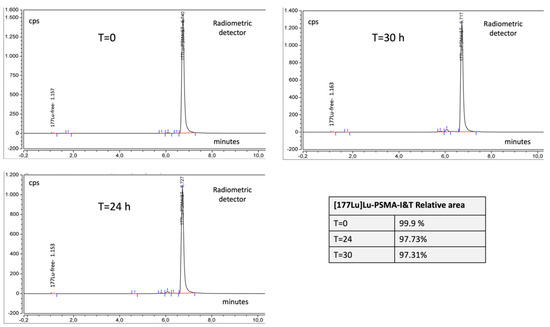 [177Lu]Lu-PSMA-I&T (radiometric detector) during stability studies, at T = 0, T = 24 h, T = 30. In the table inside the figure are reported relative areas of [177Lu]Lu-PSMA-I&T as a percentage of the total areas.