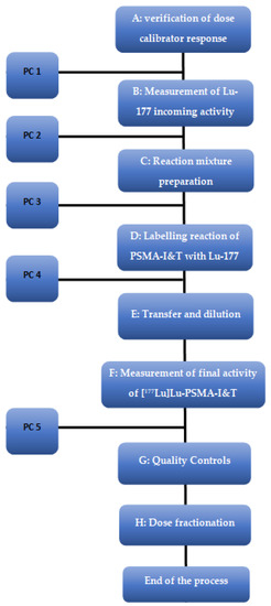 The precursor was incubated with lutetium-177 at 95 °C for 30 min in the presence of ascorbic and gentisic acid. A typical synthesis time for the complexation reaction yielding [177Lu]Lu-PSMA I&T in 60 min with a radiochemical yield of 96.8 ± 0.9% (n = 5). The flow chart of the radiolabeling of PSMA-I&T is shown in Figure 5.