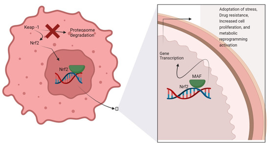 Nrf2 also contributes to chemoresistance, proliferation, and invasion [27]. Thus, Nrf2 pro-oncogenic activation in cancer is associated with mechanisms that involve both genetic and epigenetic alterations [28]. Nrf2 leads to cancer cell proliferation following certain metabolic re-programming [29]. In normal cells, Nrf2 signaling cascades afford defensive mechanisms, while attenuated Nrf2 levels lead to tumorigenesis [30,31]. For example, Nrf2-null mice were found more susceptible to exposure to carcinogens [32]. Nrf2 is the key transcription factor regulating antioxidant and xenobiotic exposure response. When oxidative stress increases, Nrf2 translocates to the cell nucleus and forms heterodimer with small Maf (sMaf) proteins. Nrf2/sMaf heterodimer binds specifically to a cis-acting enhancer called antioxidant response element (ARE) and initiates transcription of genes encoding antioxidant and detoxification proteins [33]. Nrf2 modulation in cancer cells is schematically illustrated in Figure 1.