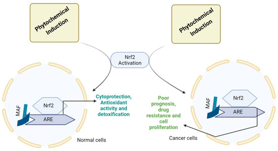 Nrf2 activation by phytochemicals leading to various events. MAF (musculoaponeurotic fibrosarcoma protein) activates antioxidant response genes by interacting with Nrf2 through ARE signaling, indicating that in response to electrophilic and oxidative stresses. In addition, in cancer cells, the imbalance in Nrf2/ARE signaling leads to drug resistance, poor prognosis, and cell proliferation. So, the consecutive Nrf2 activation might cope with the consequences in a positive manner.