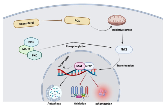 Kaempferol antioxidant potential via modulation of Nrf2. Reactive oxygen species metabolism is inhibited by kaempferol via acting on Nrf2 complex. After disintegration of the Nrf2 complex, it is translocated to the nucleus where it binds to Maf; as a result, the expression of target genes takes place, eventually causing the inhibition of inflammation, oxidation, and induction of autophagy.