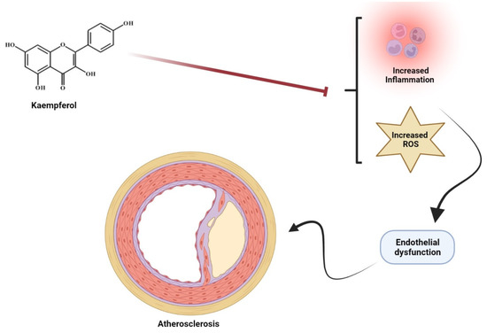 Kaempferol proposed mechanism on atherosclerosis. Kaempferol via inhibition of increased inflammation and reactive oxygen species through modulation of endothelial dysfunction that results in inhibition of atherosclerosis.
