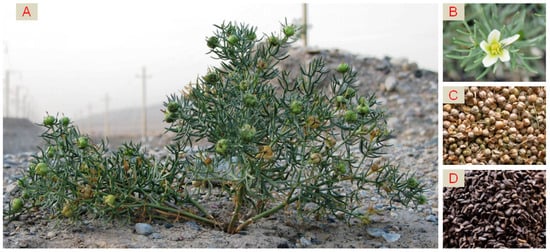 P. harmala (A) plant; (B) flower; (C) ripe fruits; (D) seeds.