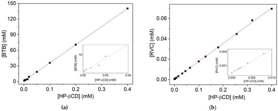 (a) BTB Solubility in HP-βCD (slope = 0.3479, R2 = 0.99977); (b) RVC Solubility Graphic In HP-βCD (slope = 0.175, R2 = 0.9994). Determined at room temperature (n = 3).