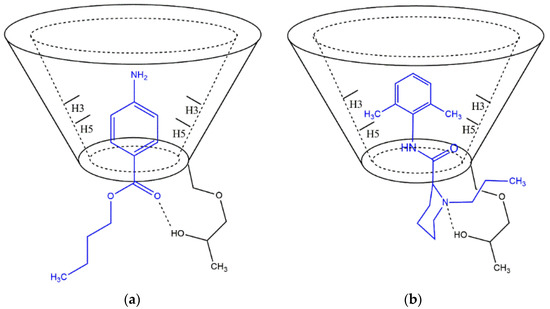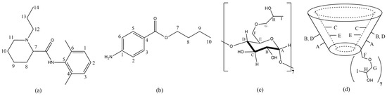- Cabeça, L.F.; Figueiredo, I.M.; Paula, E.; Marsaioli, A.J. Prilocaine–cyclodextrin–liposome: Effect of pH variations on the encapsulation and topology of a ternary complex using 1H NMR. Magn. Reson. Chem. 2011, 49, 295–300. [Google Scholar] [CrossRef] [PubMed]