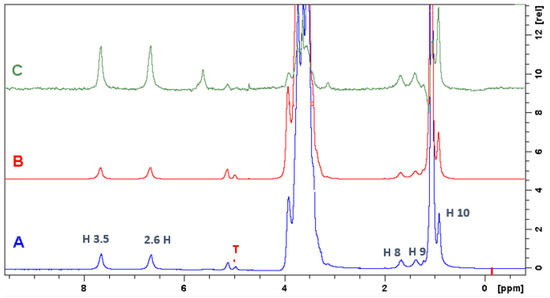 NMR experiments were carried out at the Laboratory of Nuclear Magnetic Resonance of the State University of Londrina—UEL. The equipment used was the Bruker 400 MHz for hydrogen frequency (Bruker Corporation, Billerica, MA, USA), carried out with “software” Bruker standards under typical conditions. The experiments were conducted at 25 °C, applying as reference the peak of the residual deuterium (4.70 ppm), which was used as field lock and adjusted the homogeneity of the magnetic field.