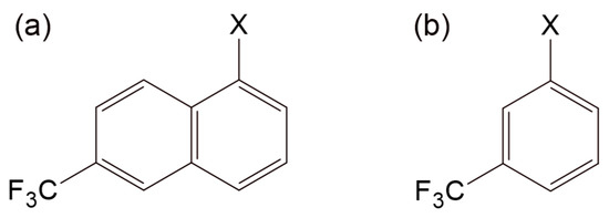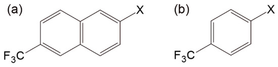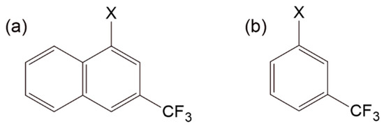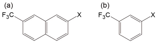 Similarity of 7-trifluoromethyl-2-X-naphthalene 2-7 (a) and m-trifluoromethyl-X-benzene X-(m-Ph)-CF3 (b).