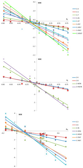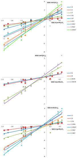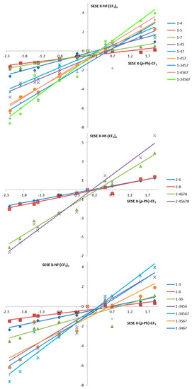 From all the examined structures, the best correlations (R2 > 0.99) show 2-6 and 2-5678 due to structural similarity: the first resembles p-X-(trifluoromethyl)benzene, whose SESE values are independent variables in this relationship; the second resembles p,m-substituted benzene with three substituents: the X and “tetra-CF3-alkadienyl” group occupying both para and meta positions.
