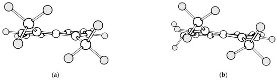 In many examples of probes with several CF3 substituents, the obtained sensitivity (a) relates to the sum of the sensitivities of the corresponding mono(CF3)substituted probes. It is worth noting, however, that in the case of the dependency of SESE values on SESE values of X-(p-Ph)-CF3, only certain groups of probes show a kind of synergism in additivity of sensitivity. Table 3 presents obtained values of the slope and values which are sums of parameters a for corresponding mono(CF3)substituted derivatives, as. For most of the probes the relative error, η, is negative (no synergism). Only for structures substituted by trifluoromethyl groups in positions 4 and 5, the value of η is positive. The majority of di(CF3)substituted probes and 1-457 show synergic additivity of the sensitivity. The sum of the sensitivities of the corresponding monosubstituted derivatives is consistent with the sensitivity of the di- or tri(CF3)substituted derivative. Only in the cases of 1-36 and 2-45 is this effect not observed, although the deviation from additivity is of the opposite nature. Structure 1-36 has separated substituents that interact less with each other than might be expected. Consequently, the actual value of the slope is lower than anticipated. On the contrary, the value of η for 2-45 is positive and the slope is more than a fifth greater than the predicted value. Moreover, 1-45 and 1-457 are characterized by positive values of η. In the group of tetra(CF3)substituted derivatives all the values of η are negative, but only for X-45NM (X = 1 or 2; N, M = 6, 7, or 8) the approximate additivity can be observed; the absolute value of the relative error is less than 10%. Structures with the CF3 groups in positions 4 and 5 have deformed aromatic rings due to the steric hindrance (see Figure 5). For this reason, the resonance component in the interaction between the substituent X and trifluoromethyl groups is less significant than in planar rings. This allows the conclusion that either the resonance effect has a negative impact, or the deformation itself has a positive impact on increasing the sensitivity of the substituent effect probes.
