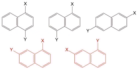 In contrast to benzene, naphthalene could be substituted with more than one conjugated probe group (putting aside the ortho-substitution). It gives us a chance to examine a higher number of structures and interactions between substituents. Possible structures of disubstituted naphthalenes are shown in Scheme 1 and Scheme 2. In para-type structures, interactions between donor and acceptor are inductive and resonance while in meta-type structures interactions are mostly inductive. Derivatives marked as red have different mutual orientation of substituents. It can be important in terms of e.g., field effect.