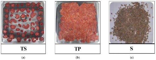 Dried tomato samples: (a) tomato slices (TS); (b) tomato pomace (TP); (c) tomato seeds (S).