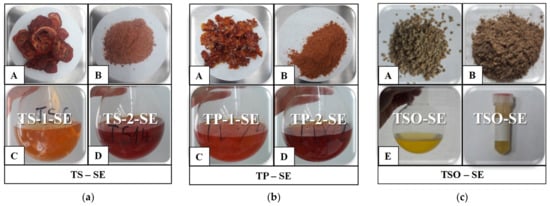Tomato samples and raw extracts obtained with Soxhlet extraction (SE) using extraction solvents (1) bioethanol and (2) ethyl acetate, A—samples before grinding, B—samples after grinding, C—bioethanol extract (1), D—ethyl acetate extract (2), E—hexane extract before and after evaporation of the solvent: (a) tomato slices (TS); (b) tomato pomace (TP); (c) tomato seeds (S).