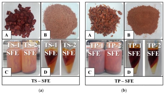 Tomato samples, raw extracts and centrifuged fractions obtained with supercritical CO2 extraction (SFE) using operating parameter set (1) at 400 bar, 70 °C, 9 kg/h and set (2) at 450 bar, 70 °C, 11 kg/h. A—before grinding, B—after grinding, C—operating parameter sets raw extracts (1,2), D—operating parameter sets centrifuged extracts (1,2): (a) tomato slices (TS); (b) tomato pomace (TP).