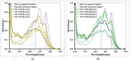 Pure lycopene, pure β-carotene, SE and SFE raw extracts’ spectra in acetone/hexane (v/v, 1:1) are presented in Figure 4. The maximum absorption peaks of pure lycopene are at 447 nm, 473 nm and 504 nm wavelengths, while for β-carotene, they are at 426 nm, 454 nm and 480 nm []. All the raw extracts presented specific shapes of carotenoids, with three peaks, at lycopene and β-carotene’s maximum absorption wavelengths. SE raw extracts obtained with bioethanol (1) had lower absorbance values than ethyl acetate (2) raw extracts. This shows that there are differences between the amounts of carotenoids extracted by these solvents. Moreover, a difference in the absorbance values of extracts obtained by SFE for both operating parameter sets was observed. SE raw extracts were more concentrated in carotenoids than SFE, similar absorbance values being reached at different concentrations, namely 0.2 g/L for SE and 0.8 g/L for SFE raw extracts.