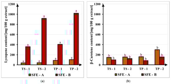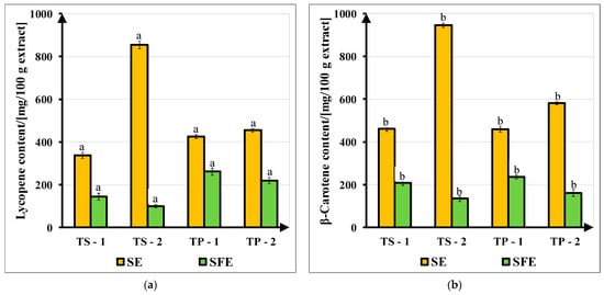 Carotenoid content of SFE fractions (SFE-A and SFE-B) obtained from tomato slices (TS) and tomato pomace (TP) with operating parameter set (1) at 400 bar, 70 °C, 9 kg/h and set (2) at 450 bar, 70 °C and 11 kg/h: (a) lycopene; (b) β-carotene. Different superscripts (a,b) indicate statistically different carotenoid concentration (p < 0.05) at a level of significance α = 0.05.