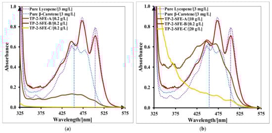 UV–VIS spectra of SFE fractions (SFE-A, SFE-B, SFE-C) obtained from tomato pomace (TP) with operating parameter set (2) at 450 bar, 70 °C and 11 kg/h (TP-2-SFE): (a) fraction concentrations (SFE-A—0.2 g/L, SFE-B—0.2 g/L, SFE-C—0.2 g/L); (b) fraction concentrations (SFE-A—10 g/L, SFE-B—0.2 g/L, SFE-C—20 g/L).