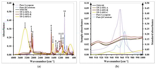 TP-2-SFE fractions contain 14 absorption peaks assigned to different functional groups, as presented in Figure 7a and Table 4. SFE-A and SFE-B fractions present specific absorption bands characteristic of carotenoids and tomato seed oil. The difference between these fractions is that TP-2-SFE-B presents lycopene and β-carotene absorption bands (958–974 cm−1), while TP-2-SFE-A seems to contain mostly β-carotene, because an absorption band is found at 963–973 cm−1. Moreover, from Figure 7b, it can be observed that the TP-2-SFE-B fraction’s absorbances are higher than TP-2-SFE-A. The TP-2-SFE-C fraction contains specific bands for O-H stretching (3000–3600 cm−1) and O-H bending (1500–1700 cm−1), specific to water and ethanol []. The ethanol content of the TP-2-SFE-C fraction results from the washing step of the plant among the SFE extraction experiments. Thus, the contribution of the SFE-C fraction was not considered for carotenoids’ quantitative analysis. Similar distributions and proportions of centrifuged fractions of TS-1-SFE, TS-2-SFE and TP-1-SFE extracts in terms of carotenoids and tomato seed oil positions and specific spectral bands were obtained.