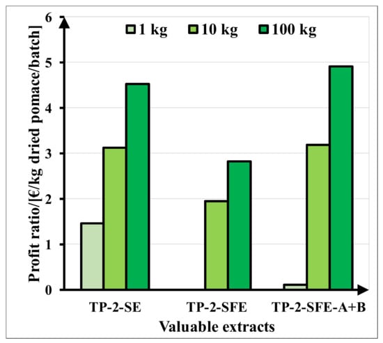 Profit ratio estimation for four valuable extracts (TP-2-SE, TP-2-SFE, TP-2-SFE-A and TP-2-SFE-B) and three scale-up capacities (1:10:100 kg dried pomace/batch).
