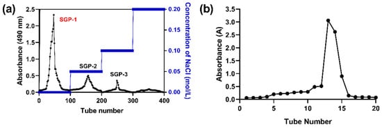 The SGP was dissolved in distilled water to prepare a sample solution of 10 mg/mL and loaded onto an ion-exchange column of DEAE Cellulose-52, which was subjected to a gradient elution using distilled water, 0.05, 0.10, 0.15, and 0.20 mol/L NaCl solution at a flow rate of 1 mL/min, respectively. Next, the purified fraction was collected and concentrated, and then dialyzed for 48 h to eliminate NaCl. Three fractions (SGP-1, SGP-2, and SGP-3) were obtained (Figure 1a). We pre-assayed the in vitro antioxidant activity of these three polysaccharides, with SGP-1 showing the strongest activity, for subsequent purification to continue other in-depth experiments.
