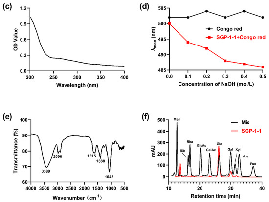 (a) Chromatography by DEAE Sepharose Fast Flow; (b) Sephadex G 100 separation; (c) UV spectra; (d) triple-helix-structure analysis; (e) FT-IR spectrum; (f) monosaccharide-composition analysis of SGP-1-1.