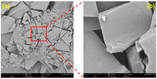 The microscopic structure of SGP-1-1 is shown in Figure 3. Irregular shapes exist and are easy to aggregate into clusters. It can be assumed that the intermolecular forces of polysaccharides are large and diverse, which is one of the properties of polysaccharides [25,26,27]. In addition, probably due to the low magnification, the SEM image of SGP (500×) reported by Zhu et al. [13] showed a flocculent, interwoven structure.