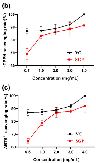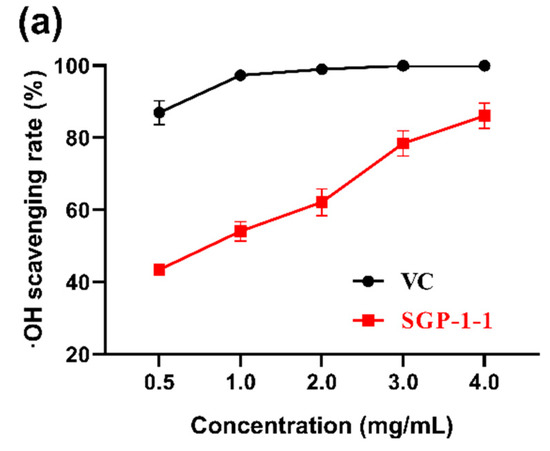 In vitro free-radical-scavenging abilities of SGP-1-1. (a) DPPH·-scavenging ability of SGP-1-1; (b) ·OH-scavenging ability of SGP-1-1; (c) ABTS+·-scavenging ability of SGP-1-1.