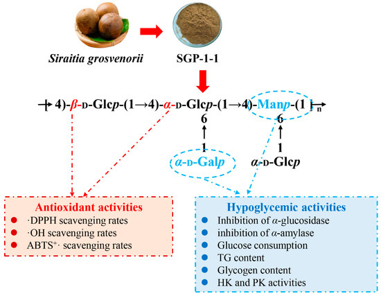 Siraitia grosvenorii (SG) is the perennial fruit of a vine in the Cucurbitaceae family, originally grown in southern China, especially in Guangxi [11]. SG has the characteristics of a sweet taste being low-calorie, as well as unique benefits related to the elimination of throat inflammation, moistening the lung for phlegm removal, and the regulation of intestinal and liver function, which are mainly due to many bioactive components in SG [12]. It is noteworthy that studies related to the bioactive components in SG have focused on flavonoids and triterpenoids [11], but in-depth studies on the structure, efficacy, and constitutive relationships of Siraitia grosvenorii polysaccharides (SGPs) are still needed [9,10,11,12]. Moreover, Zhu et al. showed that SGP has some antioxidant effects in vitro, especially on the scavenging of DPPH [13]. In addition, SGP also concentration-dependently reduced the overproduction of ROS and apoptotic/necrotic cells in H2O2-injured PC12 cells. Previous studies by our group reported that the inflammatory and antioxidant effects of SGP-1-1 (a polysaccharide extracted from SG) were studied in an inflammation-suppressed mouse model of diabetic nephropathy and elucidated the underlying molecular mechanisms of inflammation and oxidative stress in SGP-1-1 through a treated mouse model [14]. However, the specific conformational relationship between the hypoglycemic activity and the structure of SGP-1-1 is unknown.