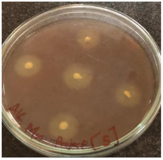 Bacterial isolate showing zone of hydrolysis after iodine solution application.
