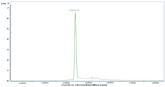 After SDS, native PAGEs, and silver staining, the pectinase was found to be a monomer with a molecular weight of 14.41 ± 1 kDa, as estimated using standard molecular weight markers (Figure 3) and LC–MS (Figure 4). Similarly, a similar molecular mass of 14.13 kDa was reported for a fungal pectinase of Aspergillus repens after ammonium sulphate partial purification, molecular exclusion, and ion-exchange chromatography purification procedures [11]. A low molecular weight of 6.5 kDa was reported for the pectinase purified from Bacillus coagulans after SDS-PAGE. The molecular mass of the bacterial polygalacturonase purified from Bacillus subtilis C4 was higher and was in the 43–66 kDa range [29].