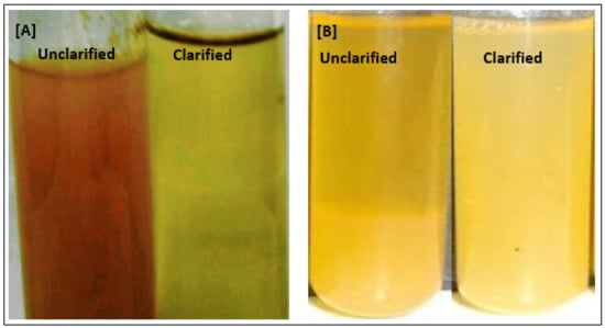 - Kareem, S.O.; Adebowale, A.A. Clarification of orange juice by crude fungal pectinase from citrus peel. Niger. Food J. 2007, 25, 130–137. [Google Scholar] [CrossRef][Green Version]