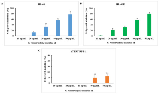 We examined the cytotoxic activity of G. rosmarinifolia EO on the HL-60 cell line and on its MDR variant HL-60R using the 3-(4,5-dimethylthiazol-2-yl)-5-(3-carboxymethoxyphenyl)-2-(4-sulphophenyl)-2Htetrazolium (MTS) assay. As shown in Figure 1, after 72 h of treatment at different concentrations (10–50 µg/mL), the EO induced inhibition of cell growth in a concentration-dependent and equivalent manner in both cell lines (A and B). The EO did not show cytotoxic activity at the same concentrations on the non-tumor cell line hTERT RPE-1 (C).