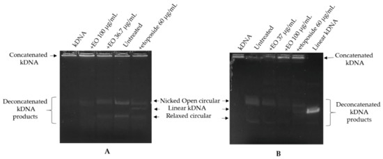 A very high concentration (100 µg/mL) of EO was also used to verify a possible change in the decatenated products. In both cell lines, etoposide was able to inhibit the formation of decatenated intermediates, but it showed the ability to stabilize the cutting complex by generating linear kDNA. The EO inhibition of topoisomerase II activity was not accompanied by stabilization of a covalent topoisomerase II-DNA intermediate. Thus, EO would seem to act as a catalytic inhibitor rather than as a topoisomerase II poison.