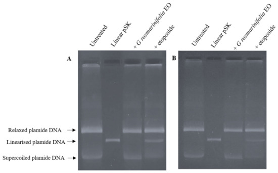 To further confirm the mechanism of action of EO as a catalytic inhibitor, a plasmid DNA linearization assay was performed. The cleavage assay experiment was carried out using nuclear extracts from untreated cells (200 ng) subsequently incubated with EO (at the corresponding IC50 values) or with etoposide (60 µg/mL) and the supercoiled pBluescript II SK (+) (pSK) plasmid DNA. The linear pSK DNA was identified by comparison with linear pSK DNA produced by the action of the restriction enzyme Pst I acting on a single site on the plasmide. Etoposide was once again used as a positive control to examine whether EO stabilized the cleavable complex. As shown in Figure 3, the addition of etoposide to the experimental mixture induced the formation of linear pSK DNA. On the other hand, the addition of EO to the reaction mixture induced no formation of cleaved linear pSK DNA.