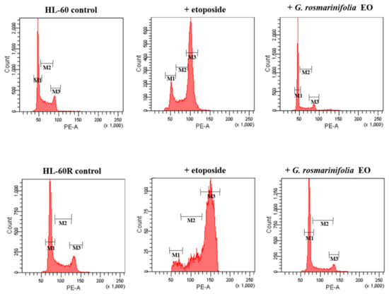 To determine cell-cycle distribution, HL-60 and HL-60R cells (1 × 105) were treated for 48 h with G. rosmarinifolia EO or etoposide (used at the respective IC50 for the two lines). After treatment, cells were collected and washed twice with ice-cold PBS and then resuspended at 1 × 106 /mL in a hypotonic fluorochrome solution containing propidium iodide (PI) 50 μg/mL and RNase (10 mg/mL) in 0.1% sodium citrate plus 0.03% (v/v) Nonidet P-40. After 45 min at room temperature (in the dark) of incubation in this solution, the samples were filtered through a nylon cloth, 40 μm mesh, and samples were analyzed using a FACSCanto instrument (Becton Dickinson, Montain View, CA, USA). The data were analyzed with BD FACSDiva software v.6.1.2. (Becton Dickinson). Cell distribution was determined by evaluating the percentage of events accumulated in the different phases of the cycle.