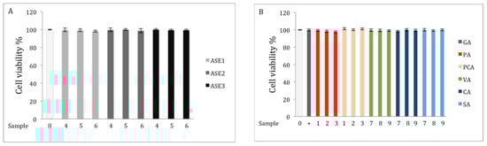 Effects of different extracts and phenolics on cell viability of RAW264.7 cells. Extracts were obtained by (A) ASE conditions, (B) pure phenolic acid standards, (C) crude polysaccharide extracts, and (D) different extraction methods. Cells were stimulated with 1 µg/mL of LPS plus varying concentrations of samples (0 = media, GA = 2 μM; 1 = 5 μM; 2 = 10 μM; 3 = 20 μM; 4 = 50 μg/mL; 5 = 100 μg/mL; 6 = 150 μg/mL; 7= 25 μM; 8 = 50 μM; and 9 = 100 μM).