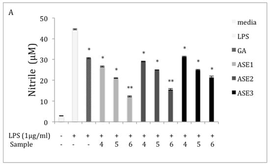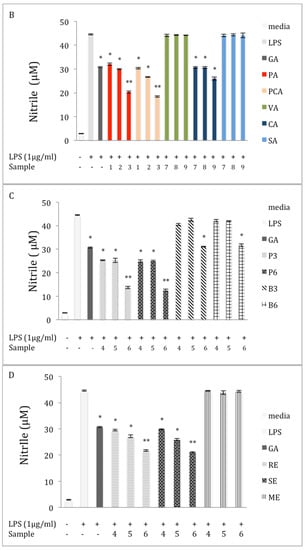 Nitric oxide is a multi-functional mediator that plays an important role in cellular signaling and a variety of physiological functions in many cells and tissues, including the brain, the vasculature, and the immune system []. Evidence indicates that the overproduction of NO is a significant contributor to inflammatory processes and may provide an indicator of the degree of inflammation [,]. Therefore, the inhibition of NO overproduction is a useful measure for assessing the anti-inflammatory effects of drugs [].
