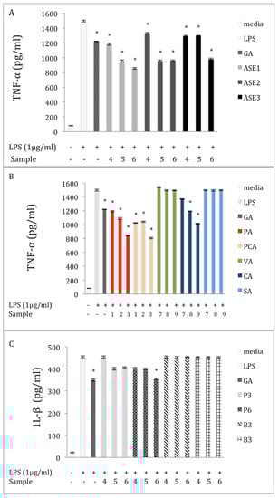 To assess the anti-inflammatory effect of chaga extracts and the pure phenolic acid standards on the expression of TNF-α, IL-6, and IL-1β were quantified using ELISA kits (e-Bioscience, Inc., Cincinnati, OH, USA). The assays were performed according to instructions provided by the manufacturer.