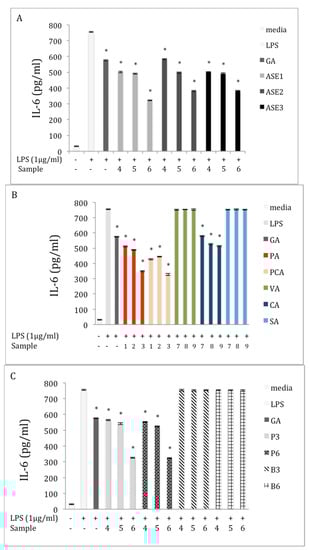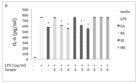 Effect of extracts and phenolics on IL-6 expression in macrophage RAW 264.7 cells (A) extracts obtained by ASE; (B) pure phenolic acid standards; (C) crude polysaccharide extracts; and (D) different extraction methods. Cells were cultured in the absence or presence of LPS (1 μg /mL) with various concentrations of different samples for 24 h (0 = media; GA = 2 μM; 1 = 5 μM; 2 = 10 μM; 3 = 20 μM; 4 = 50 μg/mL; 5 = 100 μg/mL; and 6 = 150 μg/mL; 7 = 25 μM; 8 = 50 μM; and 9 = 100 μM). IL-6 production was determined through an ELISA. The data represent the mean ± SD of triplicate experiments. Statistical significance p < 0.05 (*) was determined using one-way analysis of variance for independent means, followed by Tukey’s HSD test.